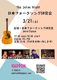 Julan Night Charge 2,750円 6時 〜 (open 5:30)> 出演:♪ pore☆pase 出演:♪ 日本フォークソング研究会 >> フライヤー << ※ 満席となりました ※ |