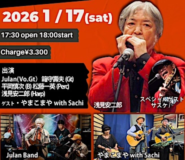 Charge 3,300円 7時 〜 (open 6:30) マカデミア長谷川 (Gt) 長谷川 昌子 (Vo/Uku/Hula) 花田金魚 (Bass) Mayumi (Vo/Uku)・Nami (Hula) |