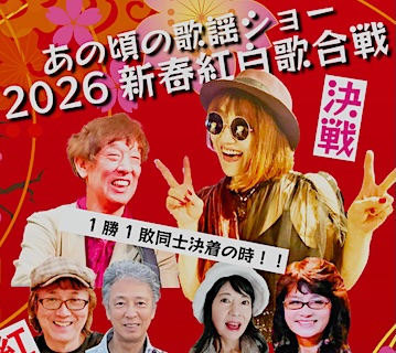 あの頃の歌謡ショー 「新春紅白歌合戦」 Charge 2,200円 6時 〜 (open 5:30) 紅組:ミズホリラックス・Chan-chi・ルナマリア陽子 白組:三多摩三郎・シーザーHide・ルナジイかっちゃん 演奏:須田 さなえ >> フライヤー << |